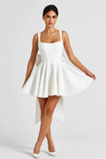 Chic, playful, and refined — this flared mini cocktail dress is designed to make a statement. Featuring a structured square neckline and a voluminous flared skirt, it creates a flattering hourglass silhouette that moves beautifully with every step. At the back, a dramatic oversized bow adds a touch of couture-inspired elegance, making it perfect for festive occasions, birthdays, or summer cocktail parties. Lightweight yet sculpted, this dress blends modern femininity with timeless sophistication.