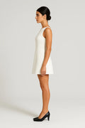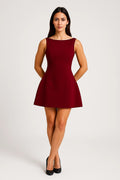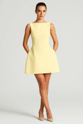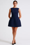 Effortlessly modern, this sleeveless A-line mini dress defines minimalist sophistication. Its trapeze cut flatters the figure while offering ease of movement, and the structured bateau neckline adds a refined touch.