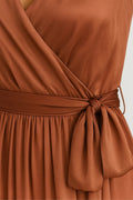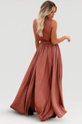 Design: Sleeveless wrap maxi dress with waist tie and side slit